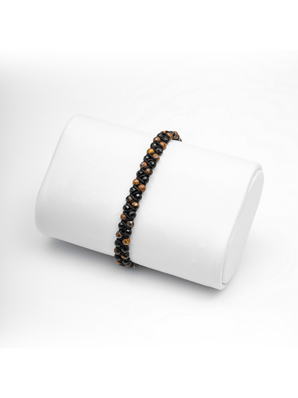 Şık siyah tonları ve doğal vurgularla bir araya gelen cesur bir bileklik, sade ve şık bir görünüm sunar.